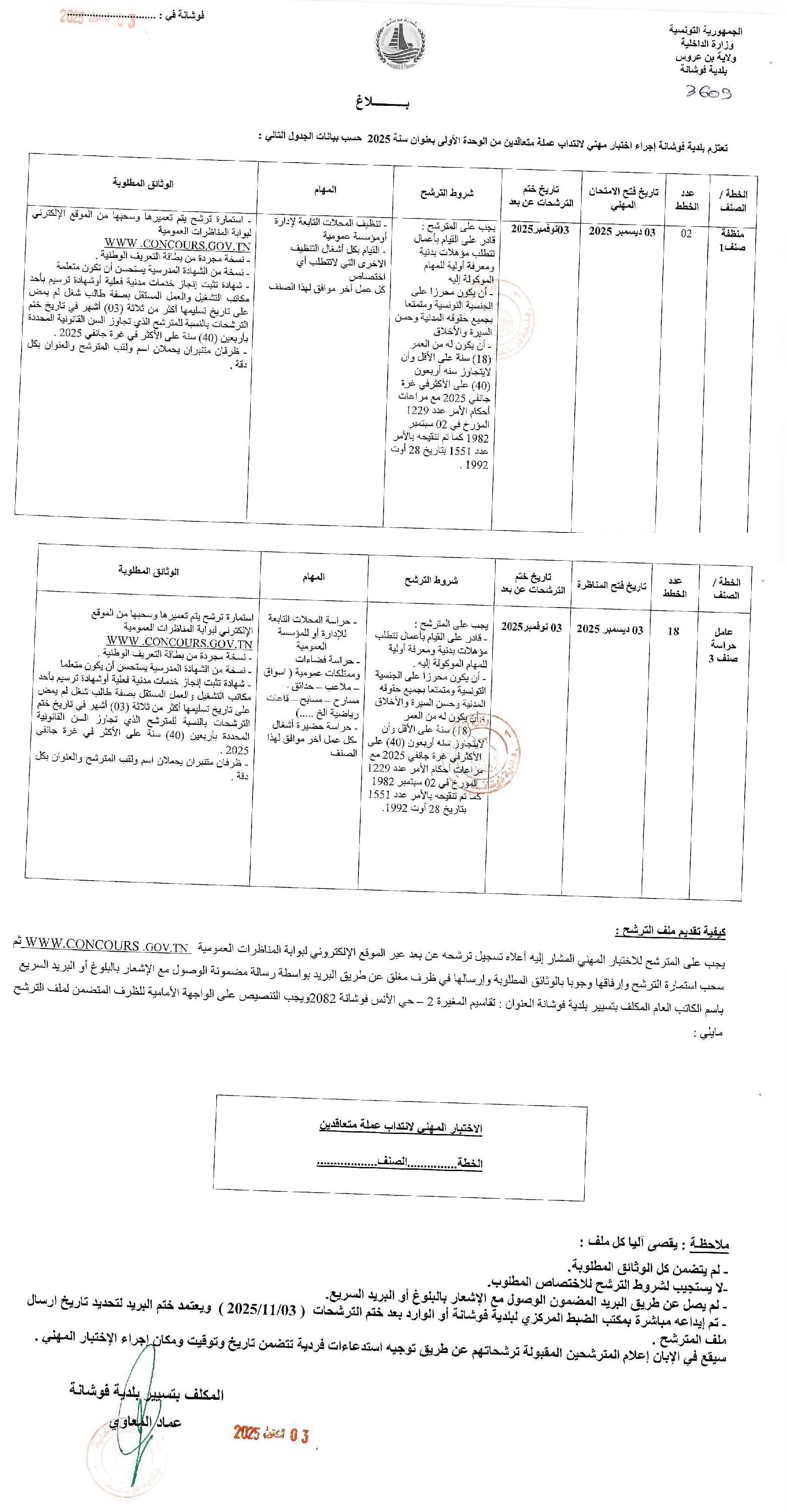 03 Oct 2025 Municipalité Fouchana إختبار مهني لإنتداب عملة متعاقدين من الوحدة الأولى . تعتزم بلدية فوشانة إجراء إختبار مهني لإنتداب عملة متعاقدين من الوحدة الأولى بعنوان سنة 2025 :